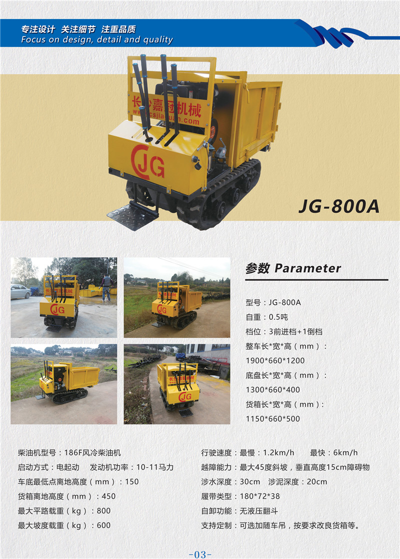 JG-800A型小型履带运输车能适应水稻田、沼泽地、泥泞的田间道路、崎岖的山路、松软的草地和沙漠、湿滑的冰面和雪地等复杂恶劣路况,在农田林地果园运输、货场装载、水利建设、基建工程、矿山场所应用广泛。